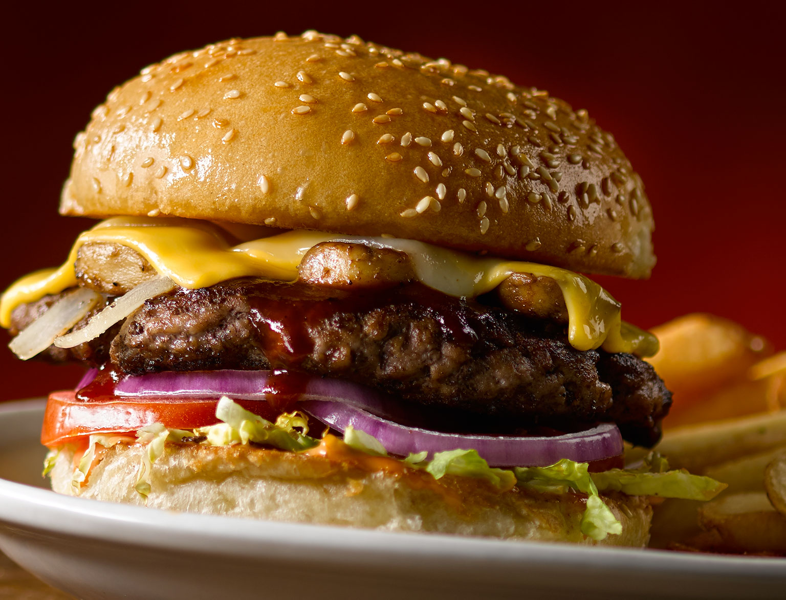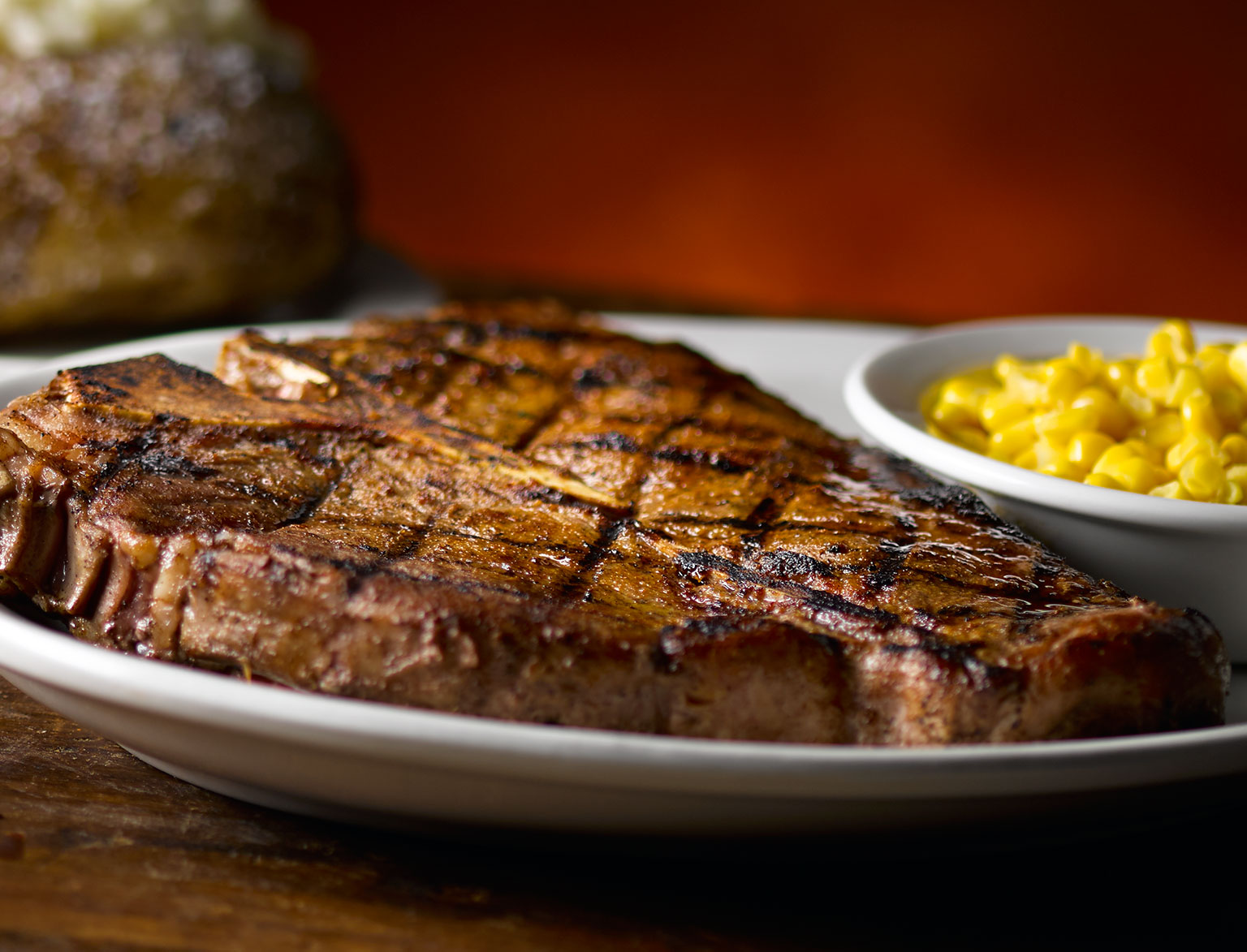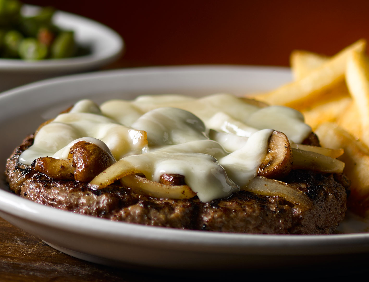 Served on a toasted Texas-sized bun with steak fries and a pickle spear.
